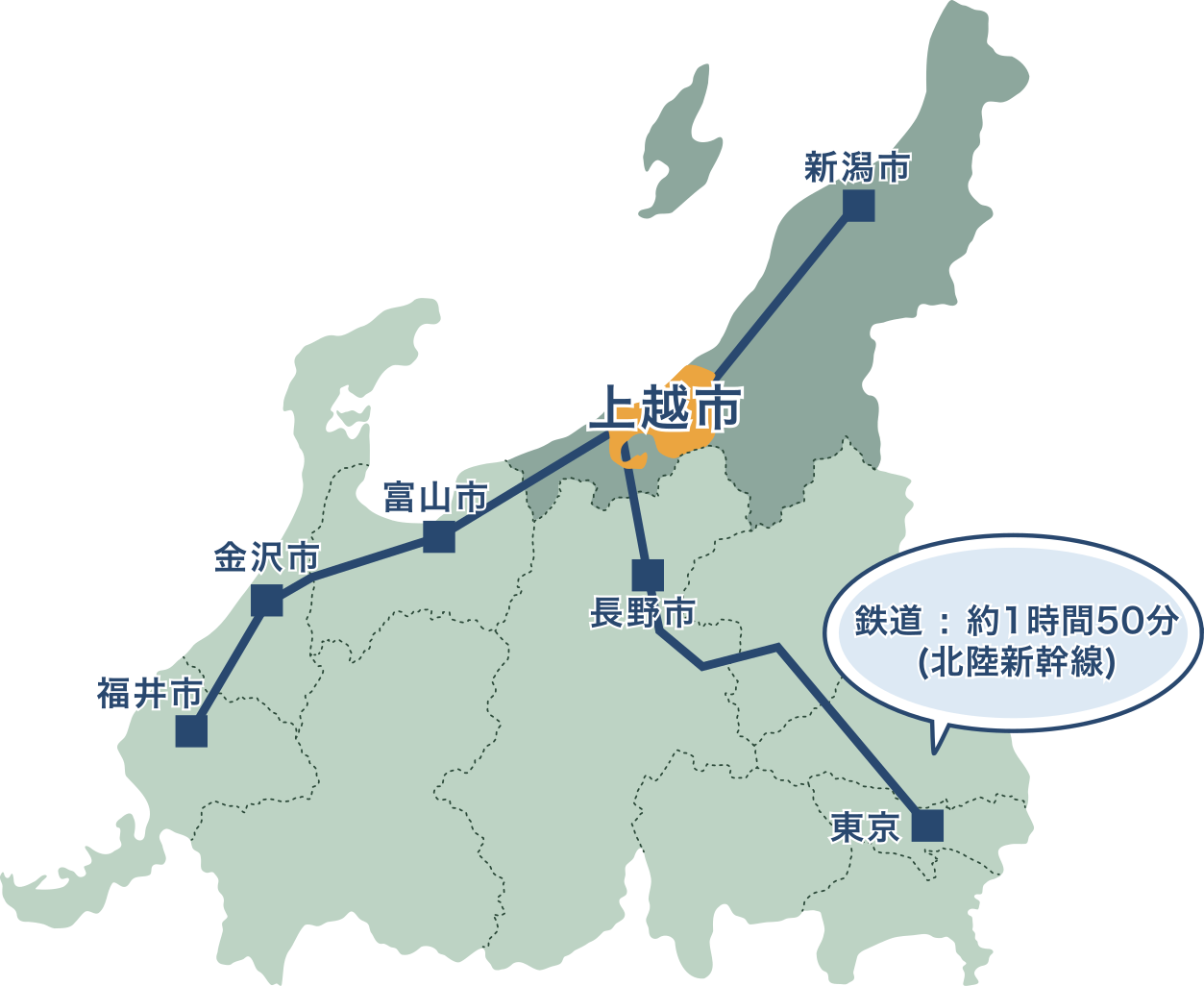 上越市は、北信越エリアの扇の要に位置し、新潟市、長野市、富山市、金沢市、福井市への移動も便利です。ビジネス拡大、人材採用力の強化に最適な場所です。